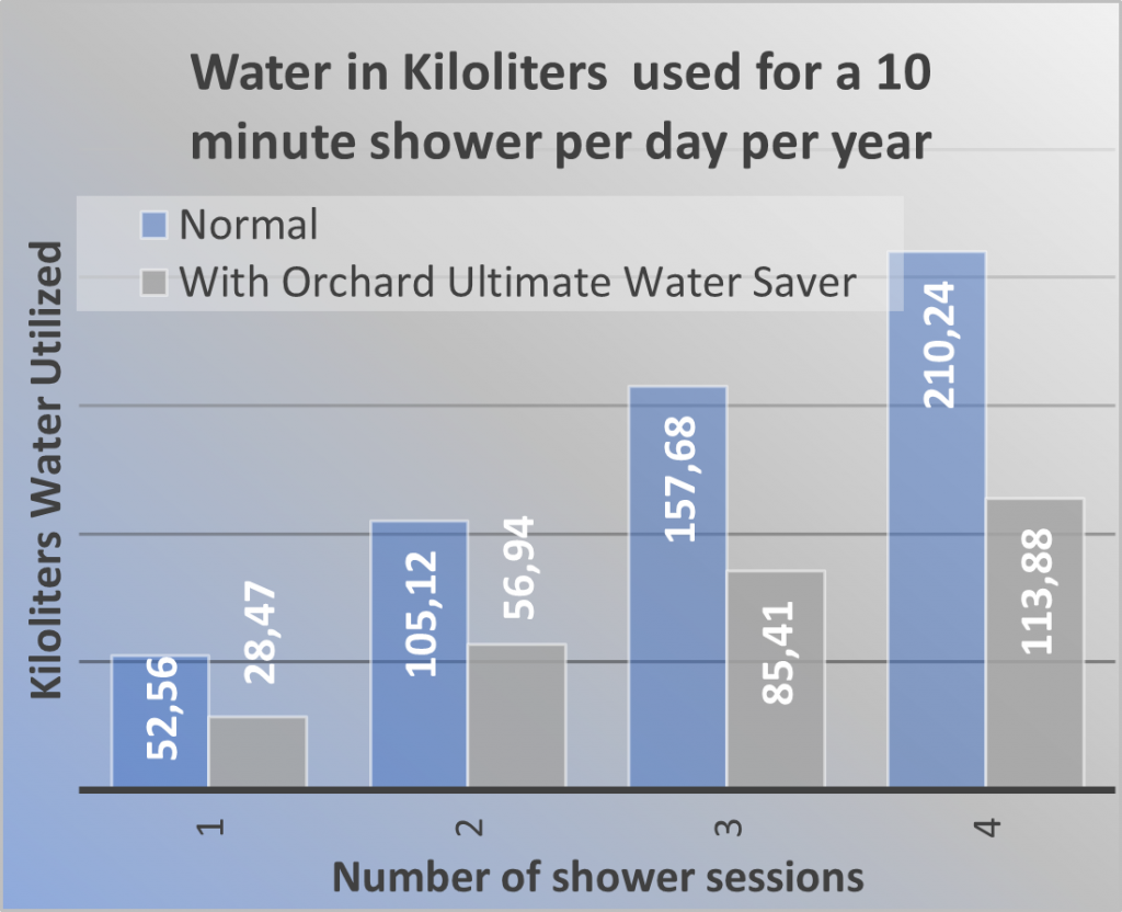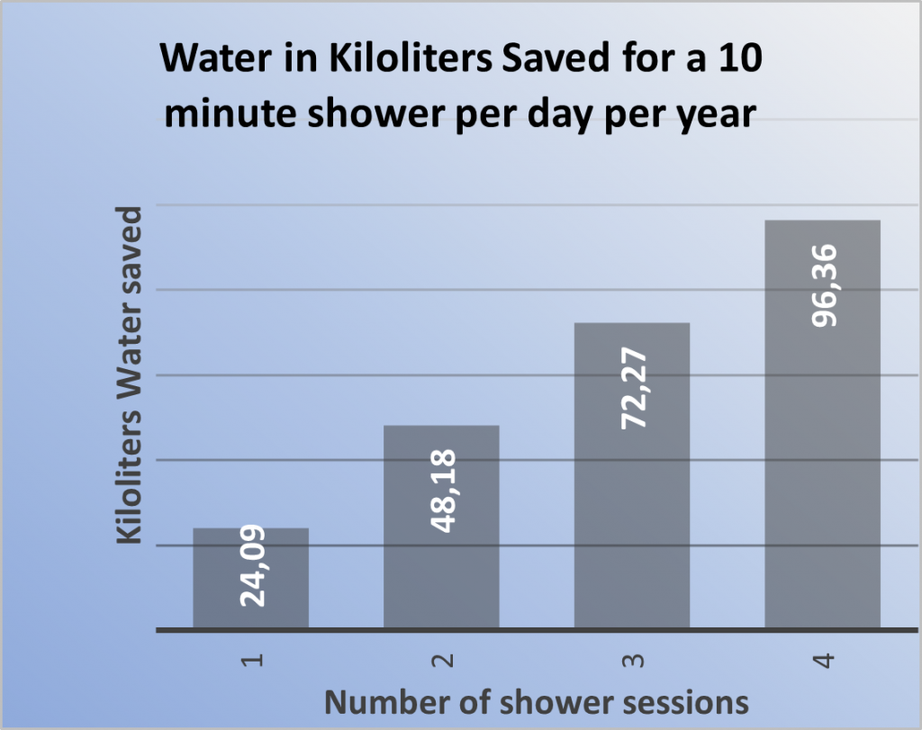 A household of 4 could save 96,360 litres of water per year if each person takes a 10 minute shower each day. This means a saving of R3,190.34 per year on your water bill. With teenagers you can look at a 15 minute shower and save even more! Studies found students shower average 17 minutes!